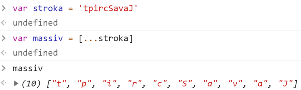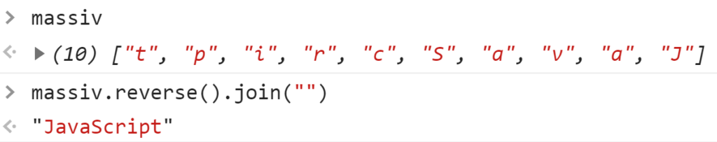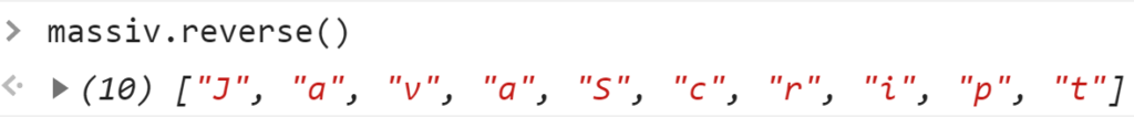 Его последовательность элементов совпадает с последовательностью символов в строке. Сейчас мы можем воспользоваться методом reverse() и перевернуть массив.