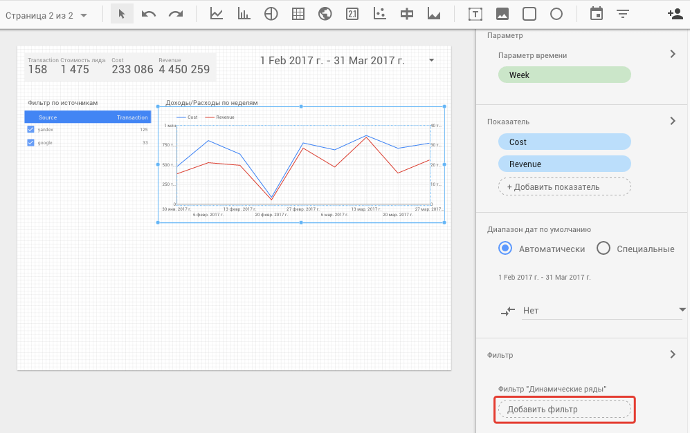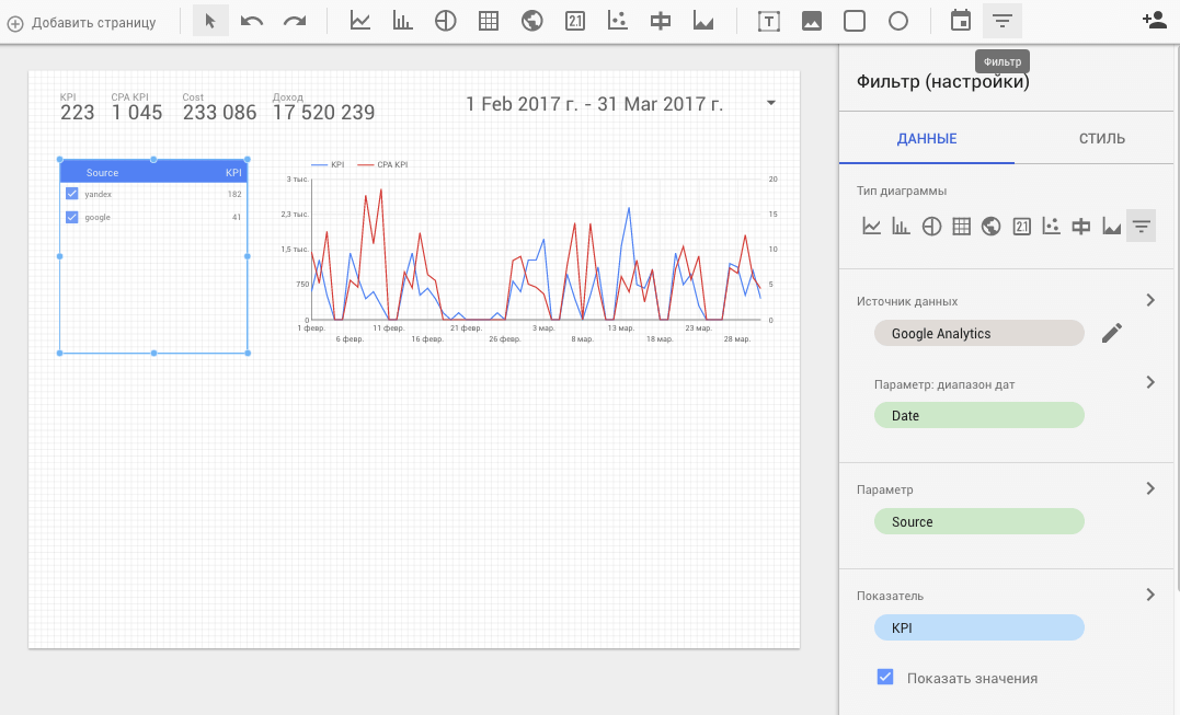 Добавим фильтр, чтобы была возможность отфильтровать график по источникам. Например, если мы снимем галочку с yandex, то график и показатели будут отбражаться только по google.