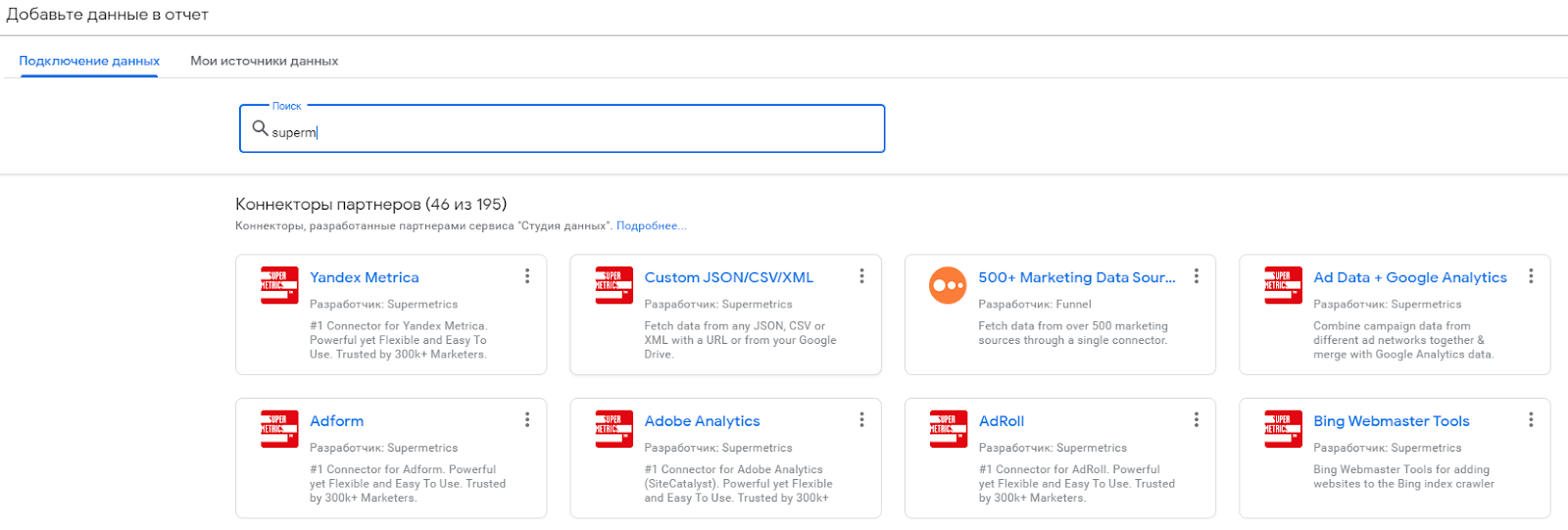 Есть также платные коннекторы, например, можно выделить интересные варианты от партнеров Data Studio , которые передают данные из сервисов Яндекса (Метрика, Директ) и других инструментов: