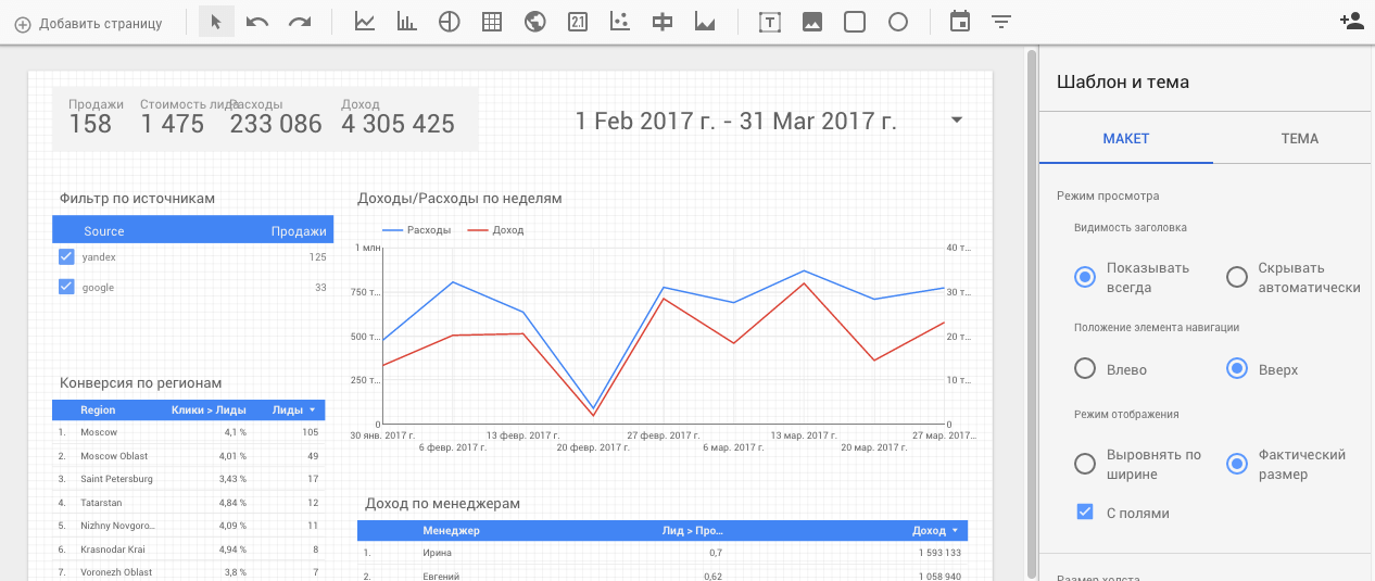 Это инструмент визуализации данных, который позволяет выгрузить данные из разных источников и свести их в онлайн-отчеты, а потом расшарить в лучших традициях Google Документов.
