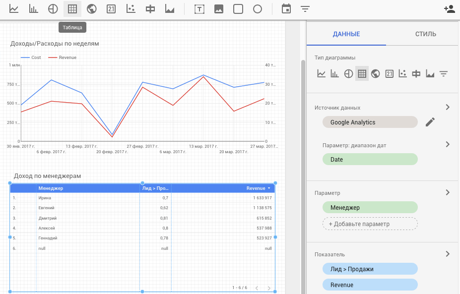 Ну и напоследок сделаем таблицу по эффективности менеджеров, так как наш Google Analytics бы интегрирован с AmoCRM, что позволяет выгружать в него продажи.