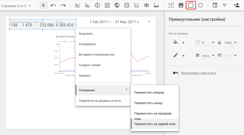 Выделим основные показатели прямоугольником и переместим его на задний план.