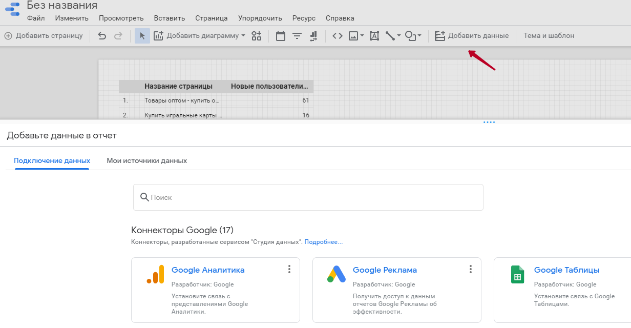 Подключить данные можно не только в начале разработки отчета, но и добавив их к уже созданному отчету. Для этого кликните на “Добавить данные” в верхнем меню: