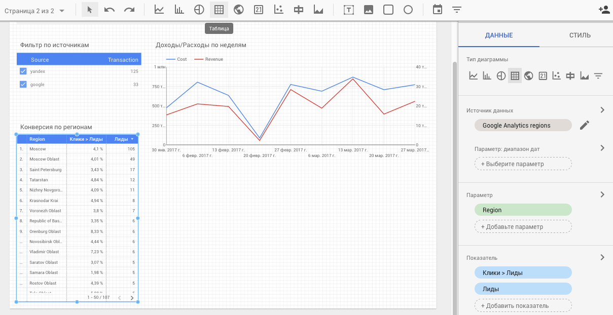 Источник данных — в одной таблице может быть >1 источника, например, можно вывести данные сразу нескольких аккаунтов Google Analytics для менеджера или подтягивать звонки из Google Таблиц.