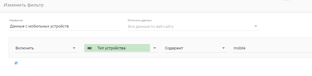 Например, мы хотим создать фильтр по отображению данных только с мобильных устройств, для этого мы: