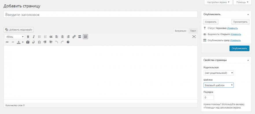 К счастью, способ создания страниц WordPress практически совпадает со способом создания постов. Единственное различие имеется в правой части экрана. Тогда как посты позволяют Вам выбирать рубрики и метки, страницы дают возможность организовывать их в иерархии, применять пользовательские шаблоны и переупорядочивать их по своему усмотрению. Итак, давайте сосредоточимся на этих возможностях.