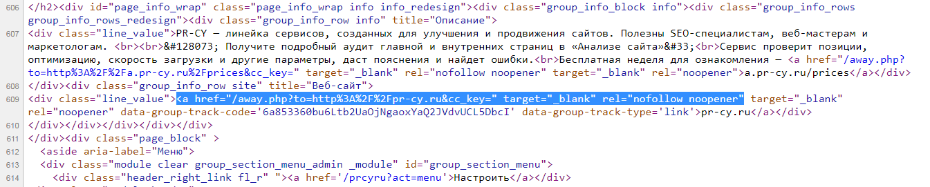 Сергей писал, что ссылки из настроек публичных страниц, которые не имеют параметра «post» в URL, учитываются и отображаются всегда. Мы проверили ссылку из описания в исходном коде страницы, сейчас она выглядит так и имеет 301 редирект: