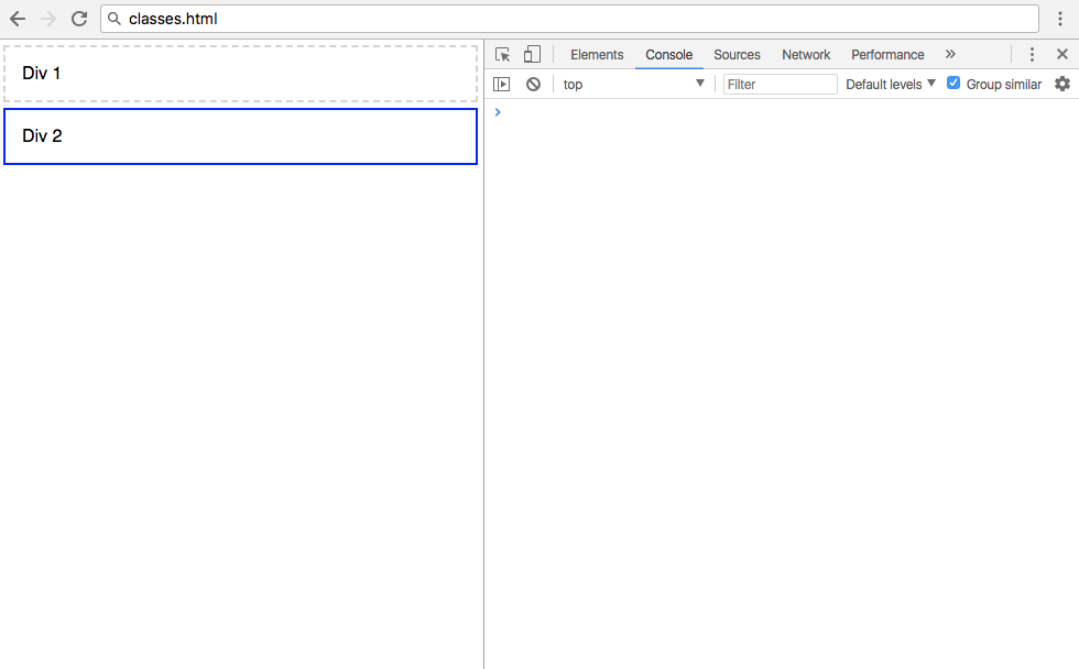 Мы создадим другой файл HTML для работы с методами класса, с двумя элементами и несколькими классами.