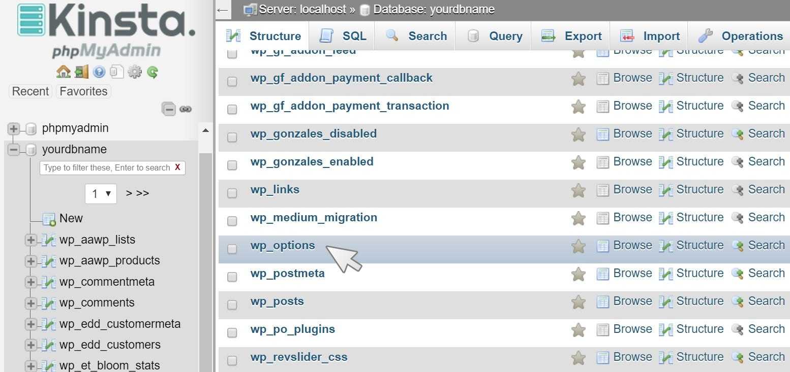 В phpMyAdmin, кликните по имени используемой базы данных. Затем прокрутите экран вниз и выберите таблицу «wp_options». Если БД имеет другой префикс, то таблица будет называться по-другому.