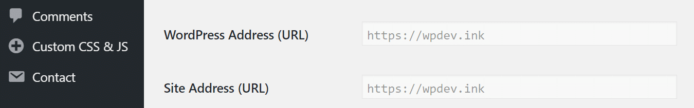 Второй способ – редактирование файла wp-config.php. Указанные в нем значения переопределяют параметры, заданные первым способом. Если поля для изменения URL (смотрите выше) недоступны для редактирования, значит их значения были установлены через wp-config.php.