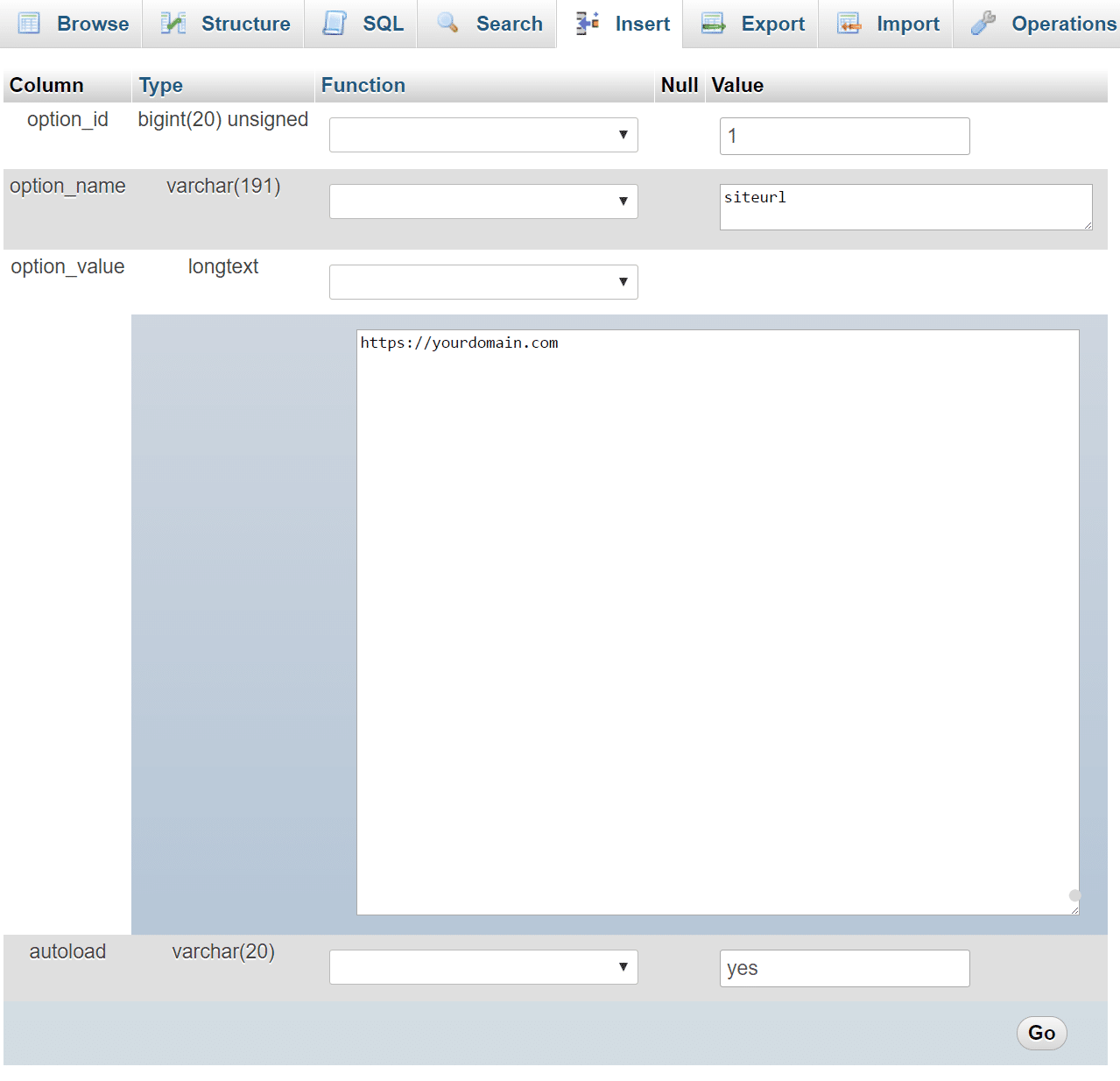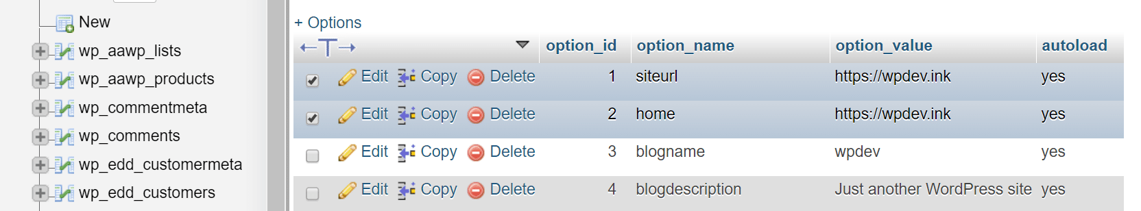 После этого вы сможете отредактировать значения строк «siteurl» и «home».