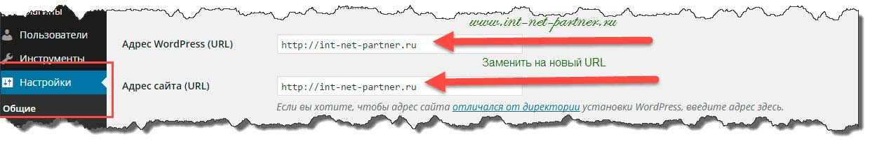 2). В полях «Адрес WordPress (URL)» и «Адрес сайта (URL)» вставьте адрес нового домена и нажмите кнопку «Сохранить изменения«. После чего Вордпресс вас сразу же переадресует на страницу входа на новом домене.