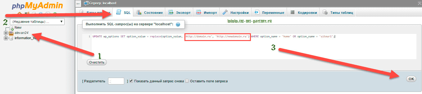 2). Нажмите на пункт «SQL» и выполните 3 запроса, заменяю адрес старого домена на новый. Запросы вводите поочередно.