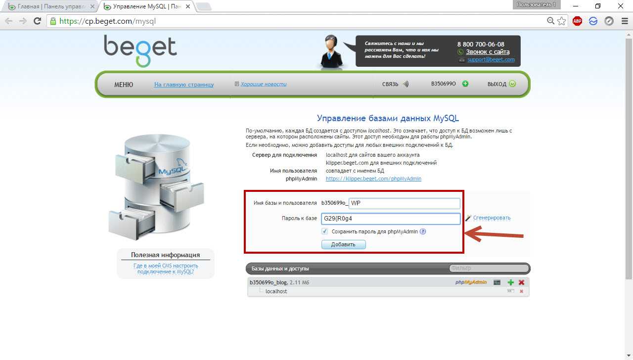 1. Создайте на своём хостинге новую базу данных. На хостинге Beget для этого в панели управления нужно выбрать MySQL, на открывшейся странице ввести имя БД, пароль к ней и нажать кнопку Добавить.