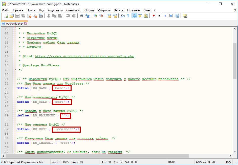 Ниже в скриншоте я выделил строки, которые нужно заменить. Название базы данных WordPress, имя пользователя MySQL, пароль MySQL — всё это мы с вами создали в предыдущем пункте.