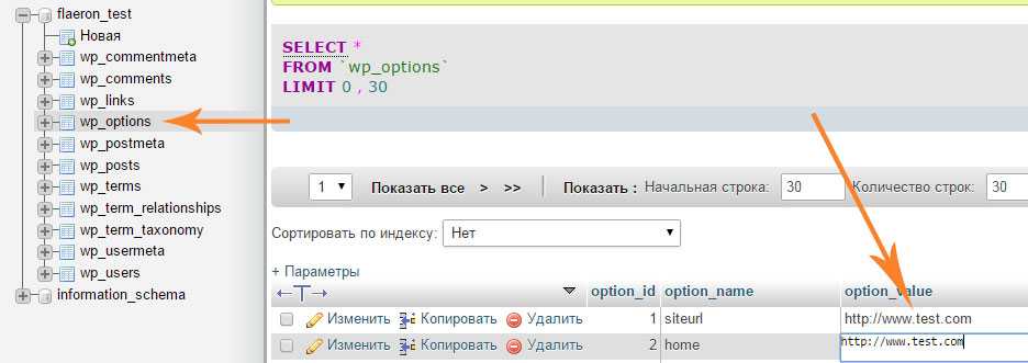 Изменяем строчки siteurl и home на адрес вашего сайта