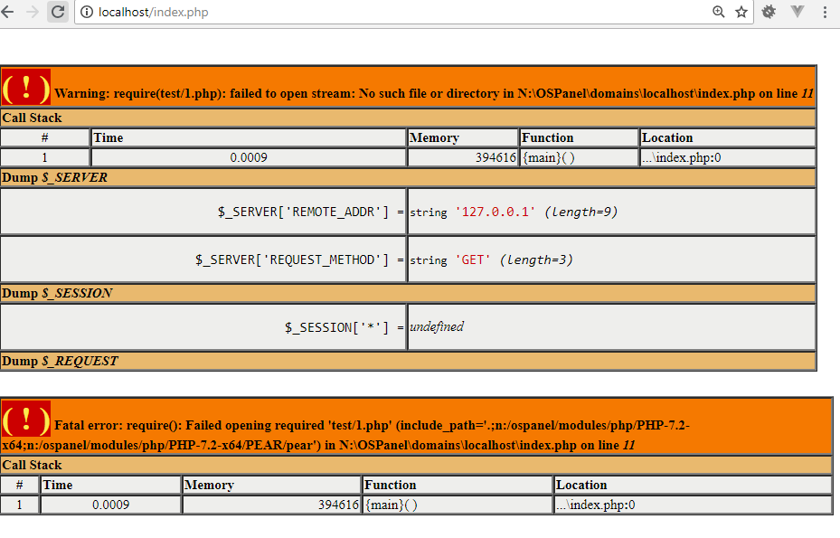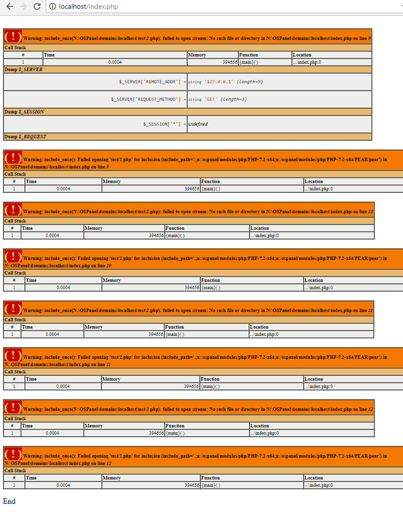 Но обратите внимание на то, что после вывода ошибки код PHP все равно продолжил выполнение и вывел `End`. Заменим `include` на `require` и запустим на выполнение