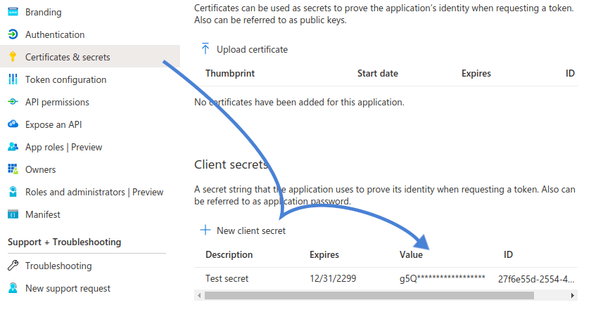 Здесь вы также настроите OneDrive для подключения к вашему плагину WordPress. Идентификатор клиента уже доступен на этой странице в качестве идентификатора приложения. Чтобы получить секрет клиента, перейдите к разделу « Сертификаты и секреты » в боковом меню и создайте новый секрет клиента; убедитесь, что вы скопировали пароль и сохранили его в надежном месте, потому что в противном случае его невозможно будет восстановить.