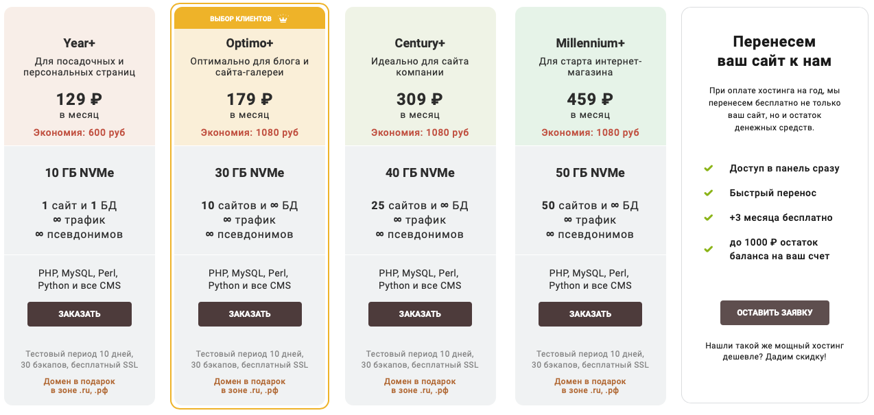 Например, Таймвеб предлагает стартовый тарифный план от 129 рублей в месяц, но в эту стоимость включён только 1 сайт, 1 база данных. За 179 рублей в месяц вы получите 10 сайтов и неограниченное количество баз данных и 30 гигабайт места на диске, а на максимальном тарифном плане за 459 рублей 50 гигабайт места и 50 сайтов.