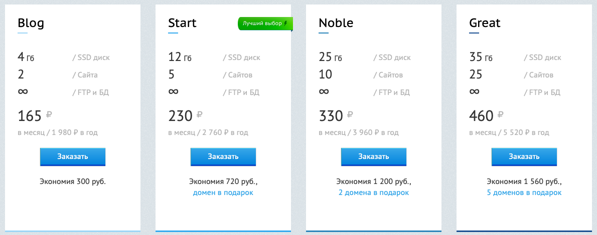 Возьмём, например, хостинг от Бегет. Они предлагают варианты за 165 рублей в месяц за 2 сайта, неограниченное количество баз данных и выделяют 4 гигабайта на жёстком диске под ваши нужды.