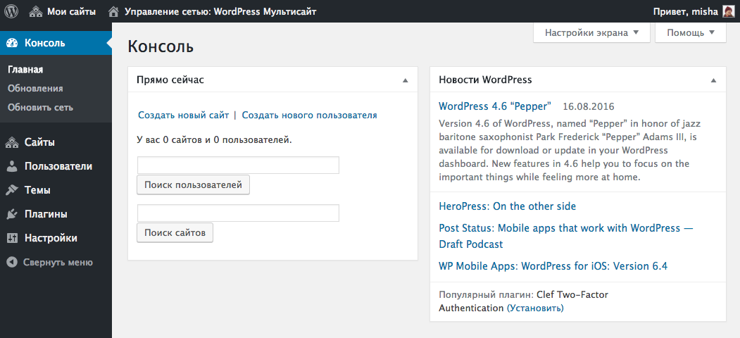 Как видите, всё очень похоже на стандартную консоль WordPress, нет только пунктов управления контентом, зато появился пункт меню «Сайты».
