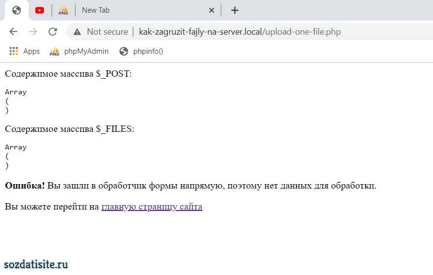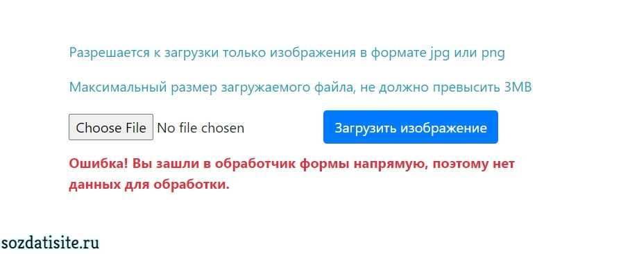 А также пользователь может перейти напрямую в обработчик, передав параметр ‘flag’: http://kak-zagruzit-fajly-na-server.local/upload-one-file.php?flag