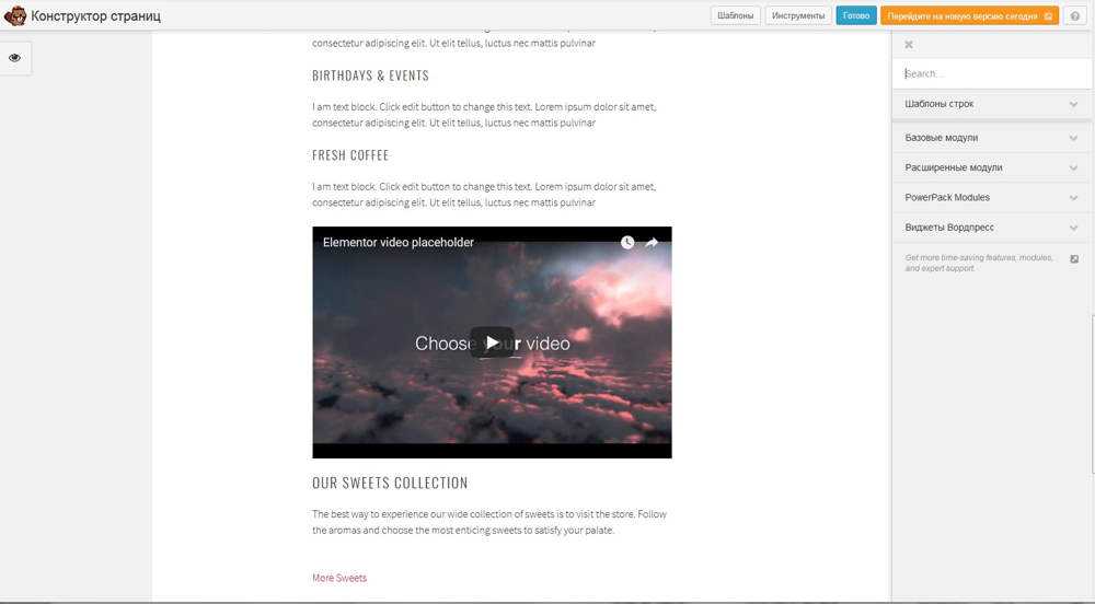 В визуальном редакторе вы можете создавать сетку из блоков для страницы, а затем заполнять эту сетку виджетами данного плагина.