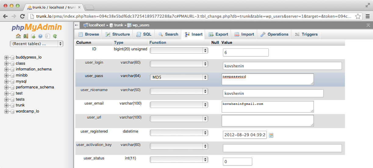 Для смены пароля очень важно выбрать функцию MD5 из выпадающего списка для поля user_pass, и затем ввести новый пароль в значении поля