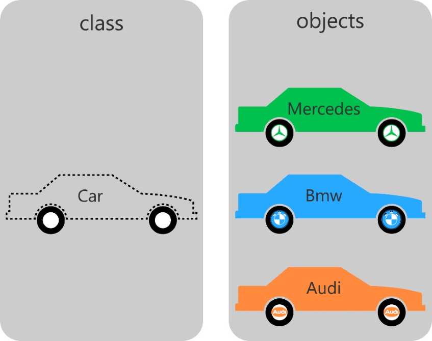 Из одного и того же класса Car мы создали три отдельных объекта с названиями: Mercedes , Bmw и Audi .