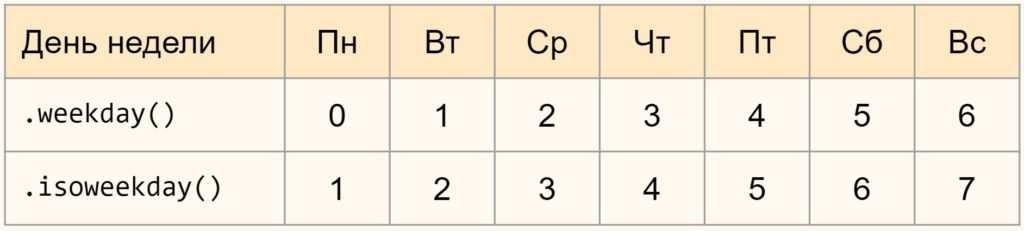 Мы также можем посмотреть на день недели, причем в двух форматах. Метод .weekday() считает, что неделя начинается с нуля, метод .isoweekday(), что с единицы.
