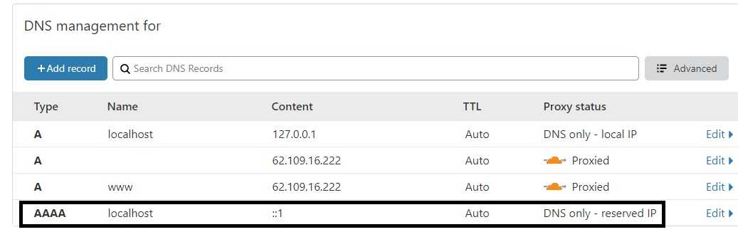 - Если там промежуточный вариант, то нужно зайти в в управление нужным доменом, найти IP привязанные к домену и отключить IPv6 (удалить все AAAA записи).