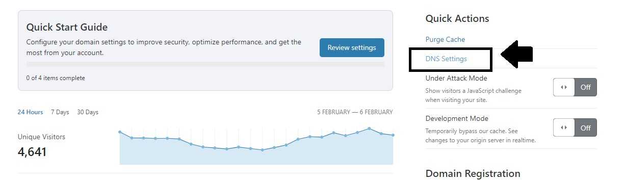 В настройках сайта на Cloudflare настройка DNS вынесена в быстрые действия в правом верхнем углу