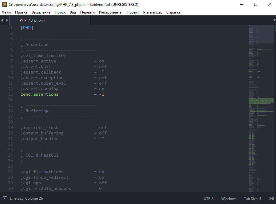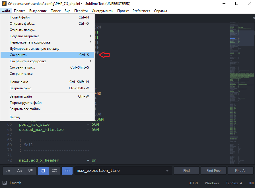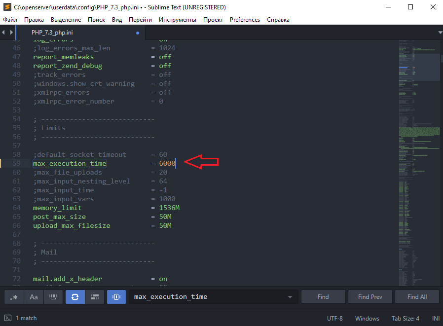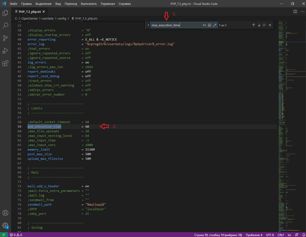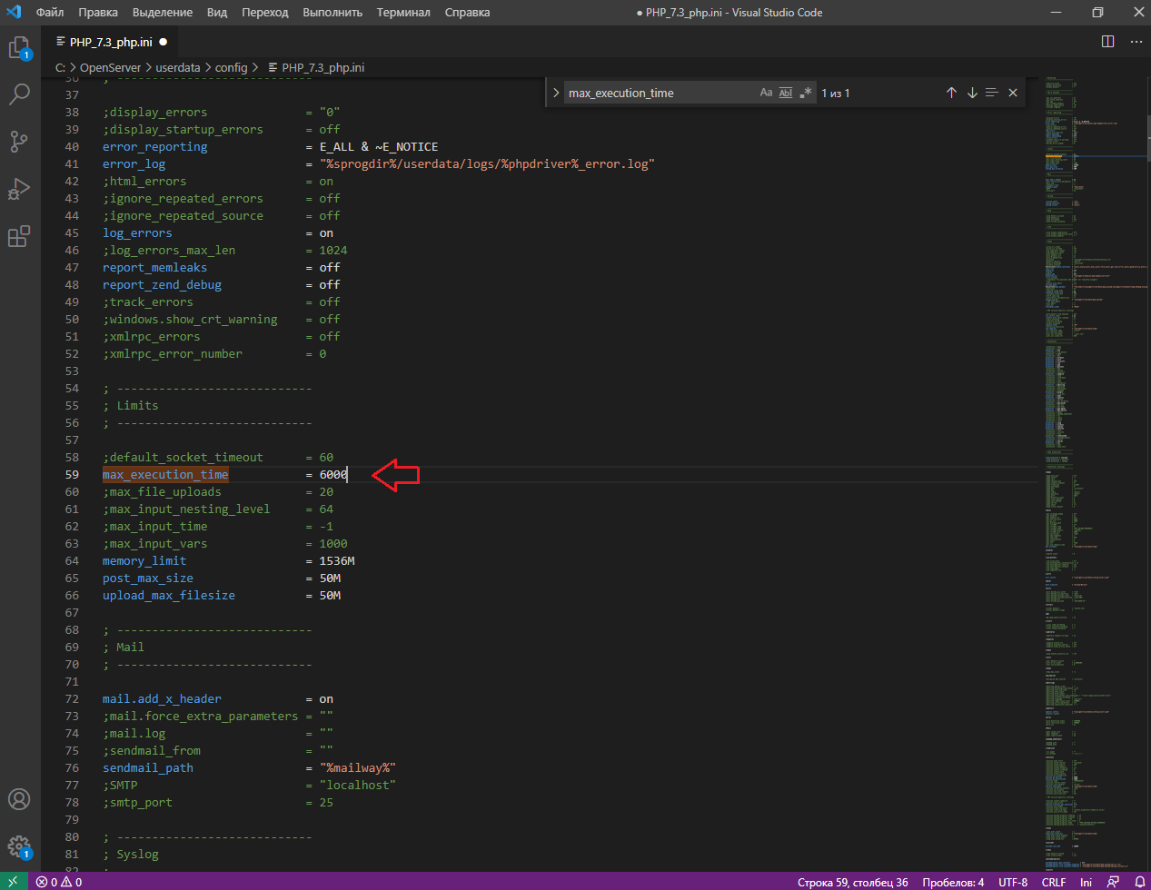 Изменяем лимит «max_execution_time» в PHP конфигурации на Open Server.