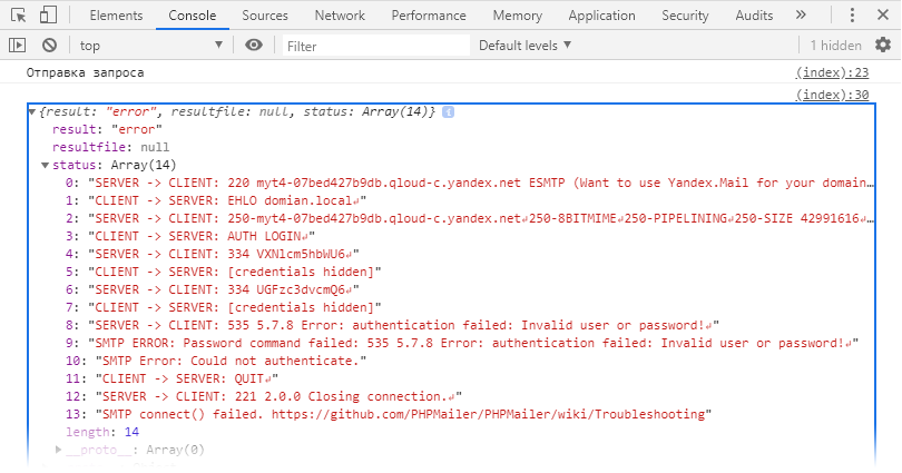 Привет. Пытаюсь настроить PHPMailer, но в логах у меня ошибка:*СЮДА ВСТАВЛЯЕТЕ ЭТИ СТРОЧКИ ИЗ КОНСОЛИ*