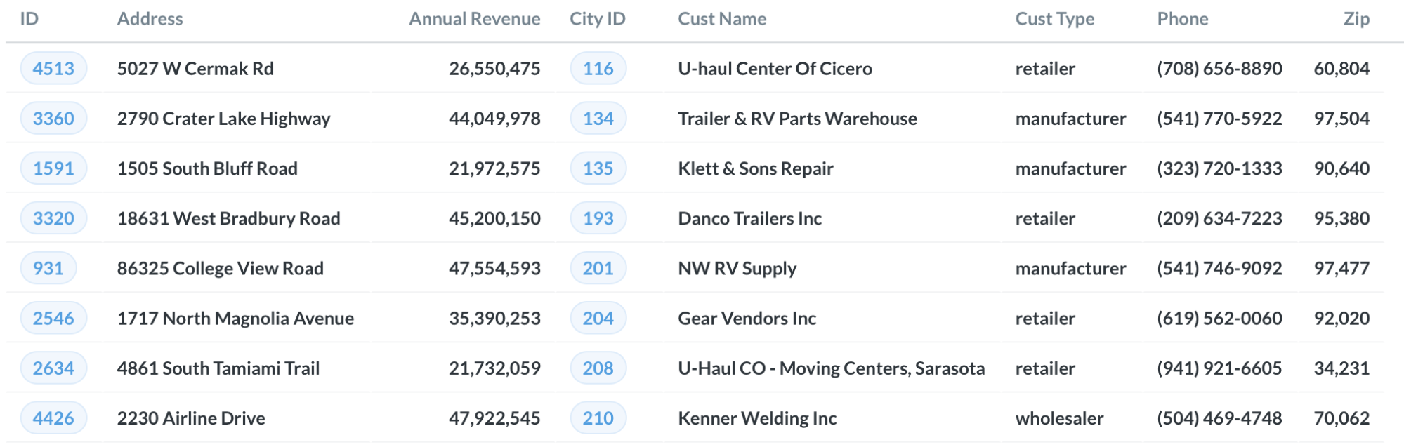 В таблице ниже представлена информация о клиентах: имя, адрес, выручка и др., — разбитая на столбцы и строки.