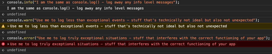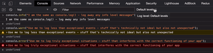 console.log(param) по умолчанию ведет журнал на уровне INFO — однако в вашем распоряжении также есть 3 других уровня ведения журнала, которые вы должны использовать — console.debug(), console.warn() и console.error()