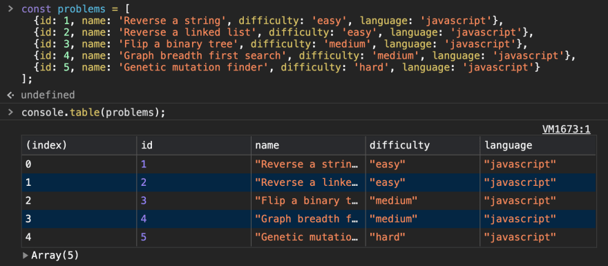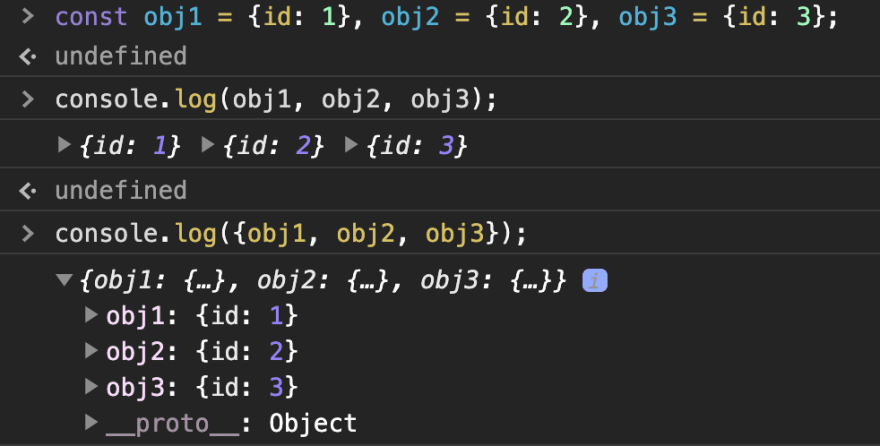 Это просто — используйте синтаксис вычисляемых свойств ES6 и заключите объекты, которые вы хотите регистрировать, в фигурные скобки внутри console.log(), то есть используйте console.log({user}) а не console.log(user). Это сделает вывод более аккуратно связанными с именем переменной, установленным в качестве ключа, и значением в качестве самого объекта. Это особенно полезно, когда вы спешите и хотите зарегистрировать несколько объектов одной командой console.log().