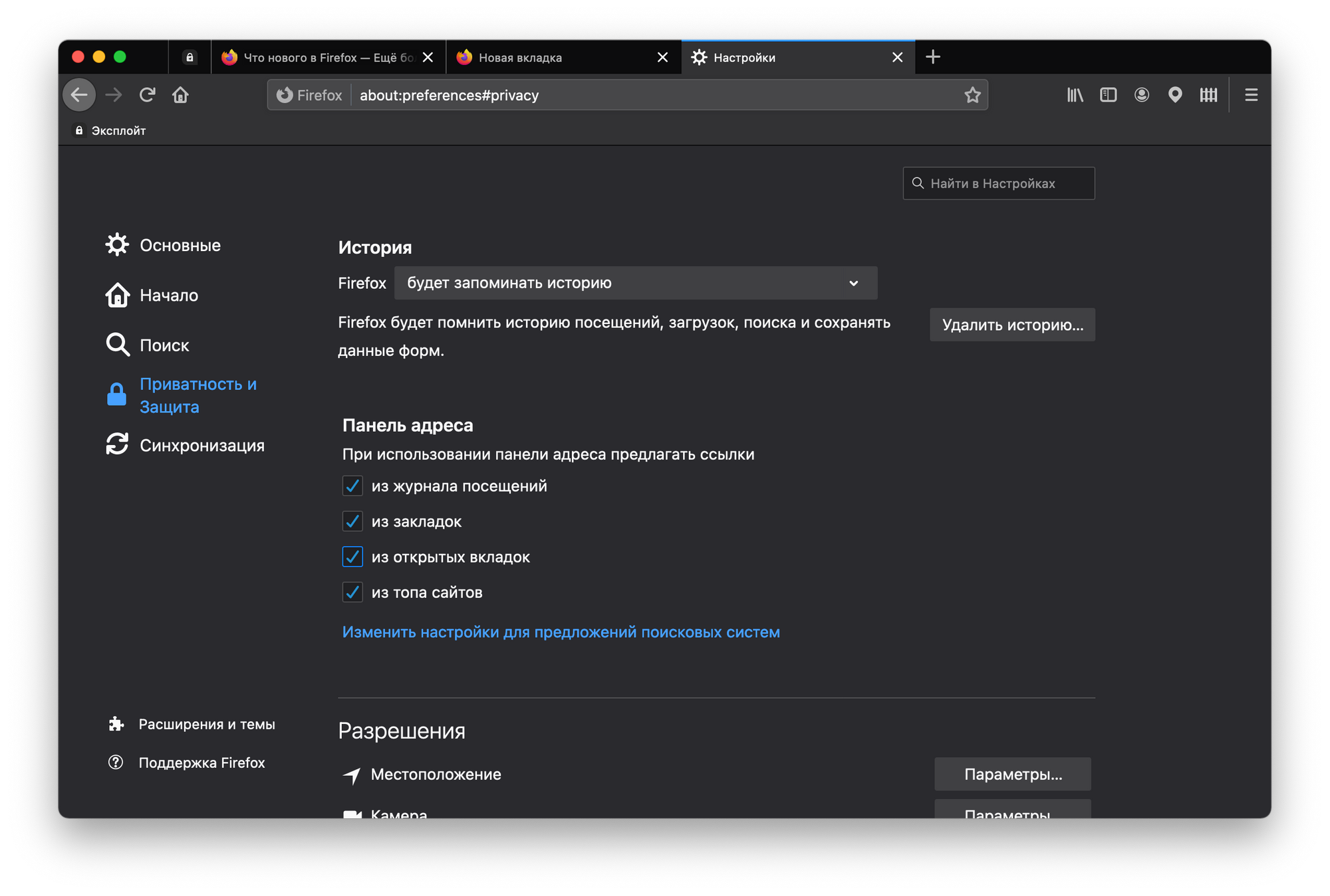 Находясь в меню «Приватность и защита», прокрутите страницу вниз до раздела «История». В раскрывающемся меню выберите параметр «Будет использовать ваши настройки хранения истории».