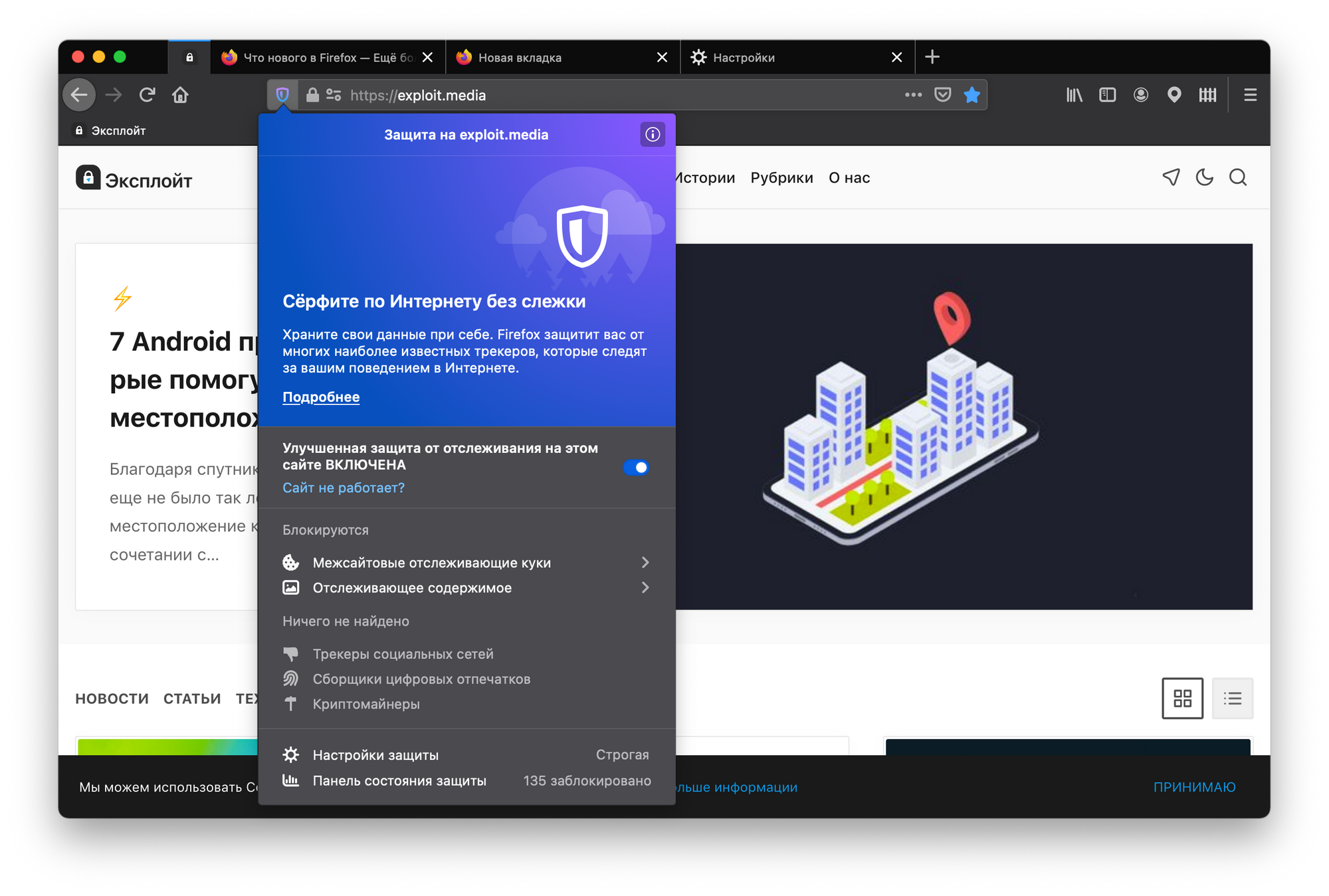 В меню «Приватность и защита» вы увидите три уровня защиты: стандартная, строгая и персональная. Выберите вариант «строгой» защиты, чтобы запретить сторонним веб-сайтам отслеживать ваши действия.