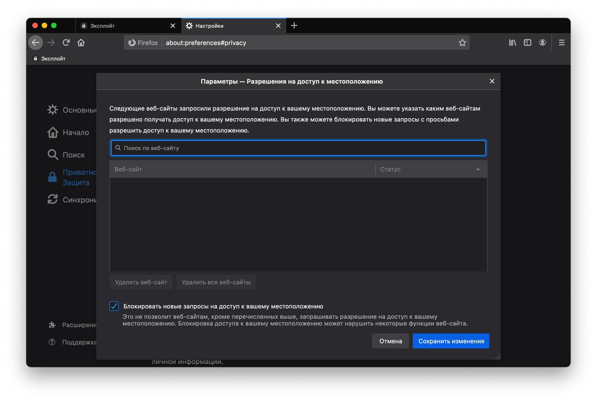 Прокрутите страницу дальше вниз до раздела «Разрешения». Настройте каждый элемент, установив флажок у пункта «Блокировать новые запросы» и нажав на кнопку «Сохранить изменения».