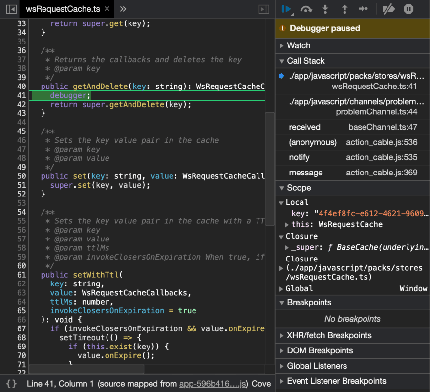 Figure 6. DevTools pauses on the line-of-code breakpoint on line 32