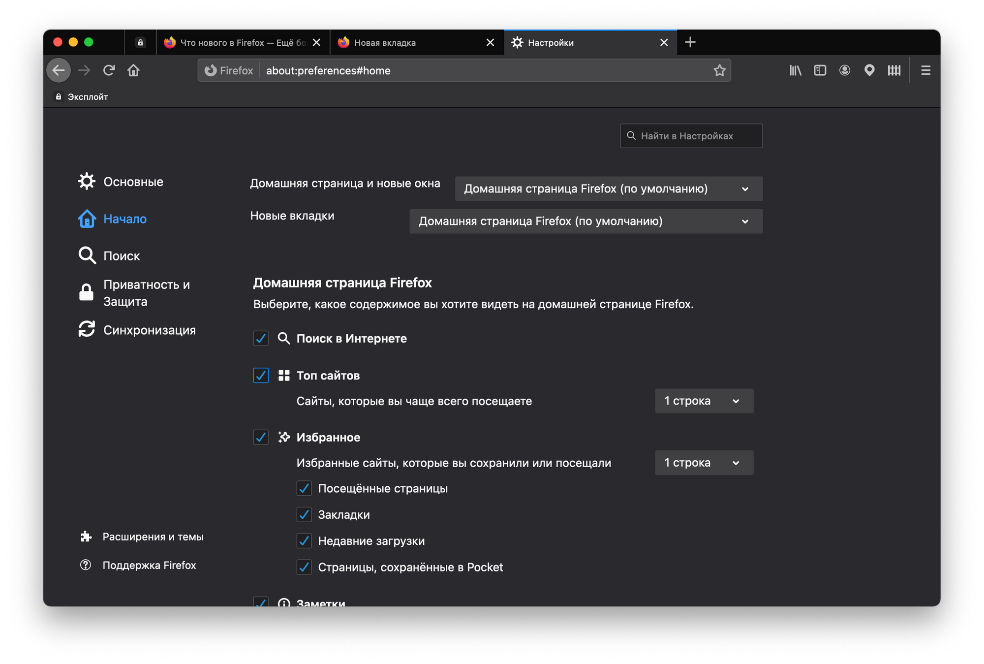 В меню «Начало» снимите флажок у пункта «Страницы, сохранённые в Pocket». Это отключит сохранение веб-контента на всех ваших устройствах, подключенных к учетной записи Firefox.