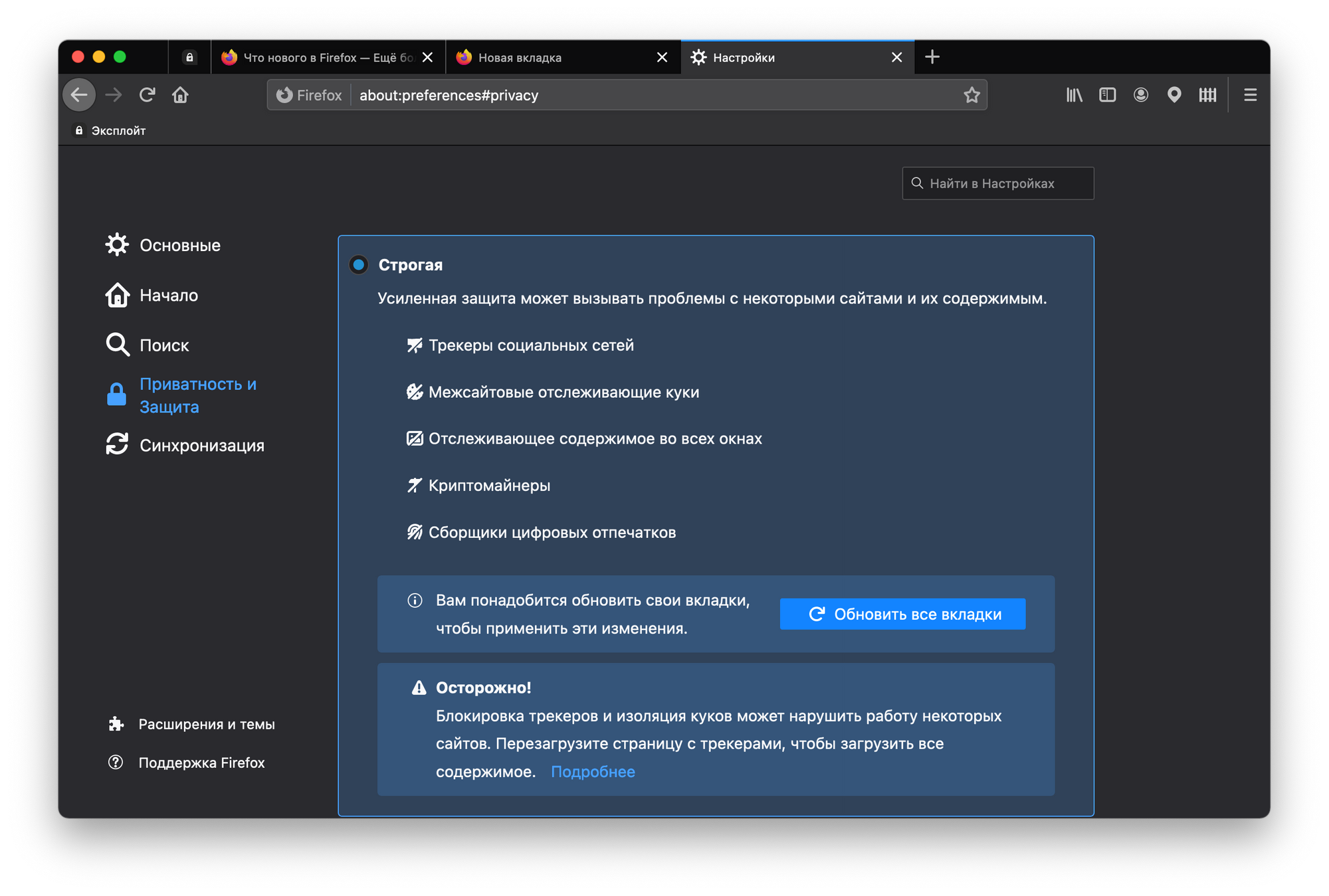 Если «строгий» уровень защиты блокирует доступ к сайту, который вы хотите посетить, просто нажмите на значок щита рядом с адресом сайта и отключите усиленную защиту отслеживания.