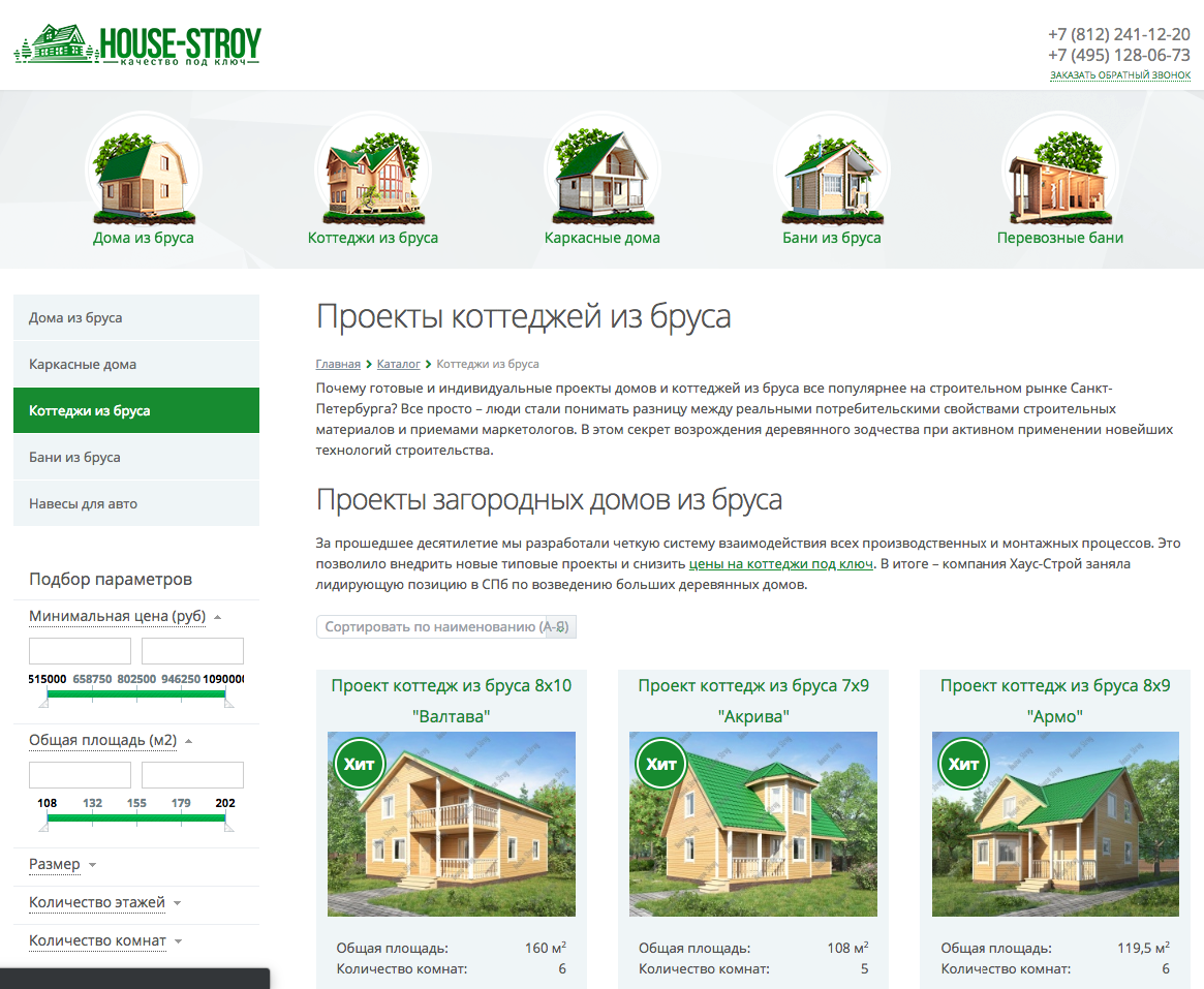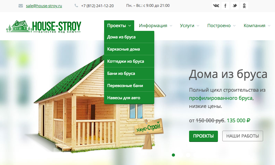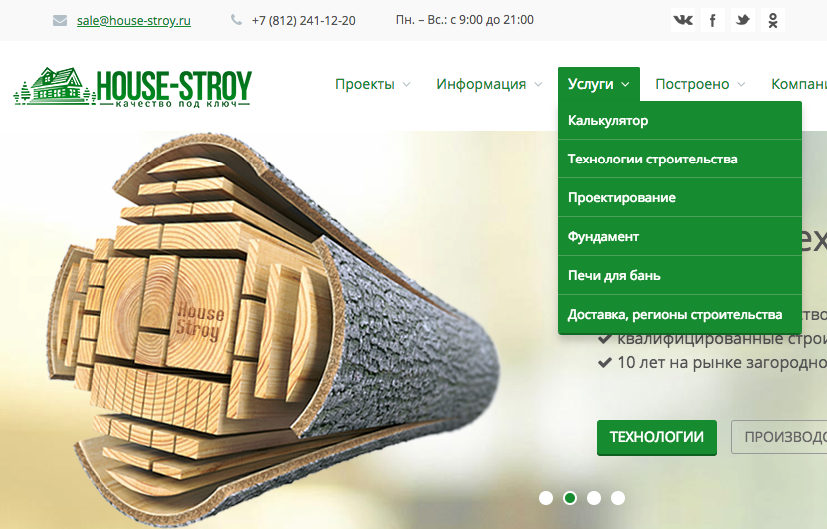 Раздел с проектами, информацией об особенностях строительства, каталогом проектов и построенных объектов, калькулятор расчета услуг, подробности о компании — на сайте есть все, чтобы ответить на любой вопрос потенциального клиента. И все это так глобально перелинковано, что можно в несколько кликов перейти с одной страницы сайта на любую другую.