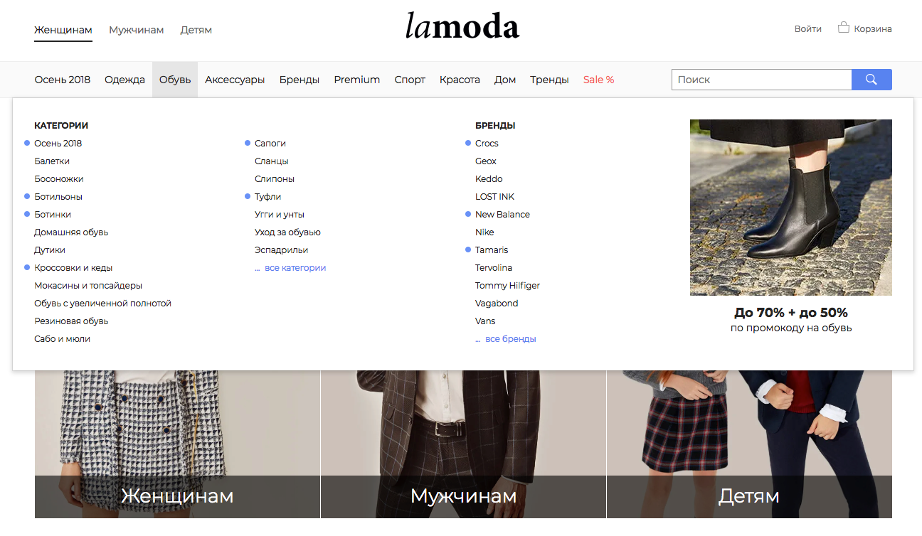 Многие покупатели ищут обувь по цвету, сезону или материалу. «Ламода» это учитывает