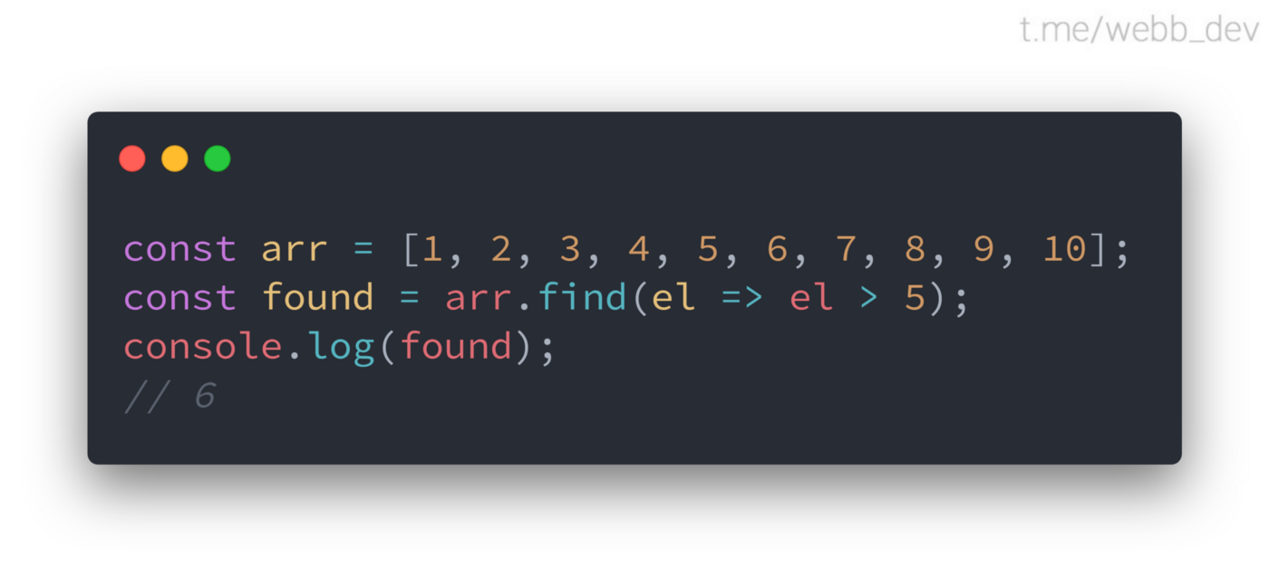 Обратите внимание на то, что в нашем примере заданному критерию соответствуют все элементы массива, следующие за тем, который содержит число 5, но возвращается лишь первый подходящий элемент. Этот метод весьма полезен в ситуациях, в которых, пользуясь для перебора и анализа массивов циклами , такие циклы, при обнаружении в массиве нужного элемента, прерывают, используя инструкцию