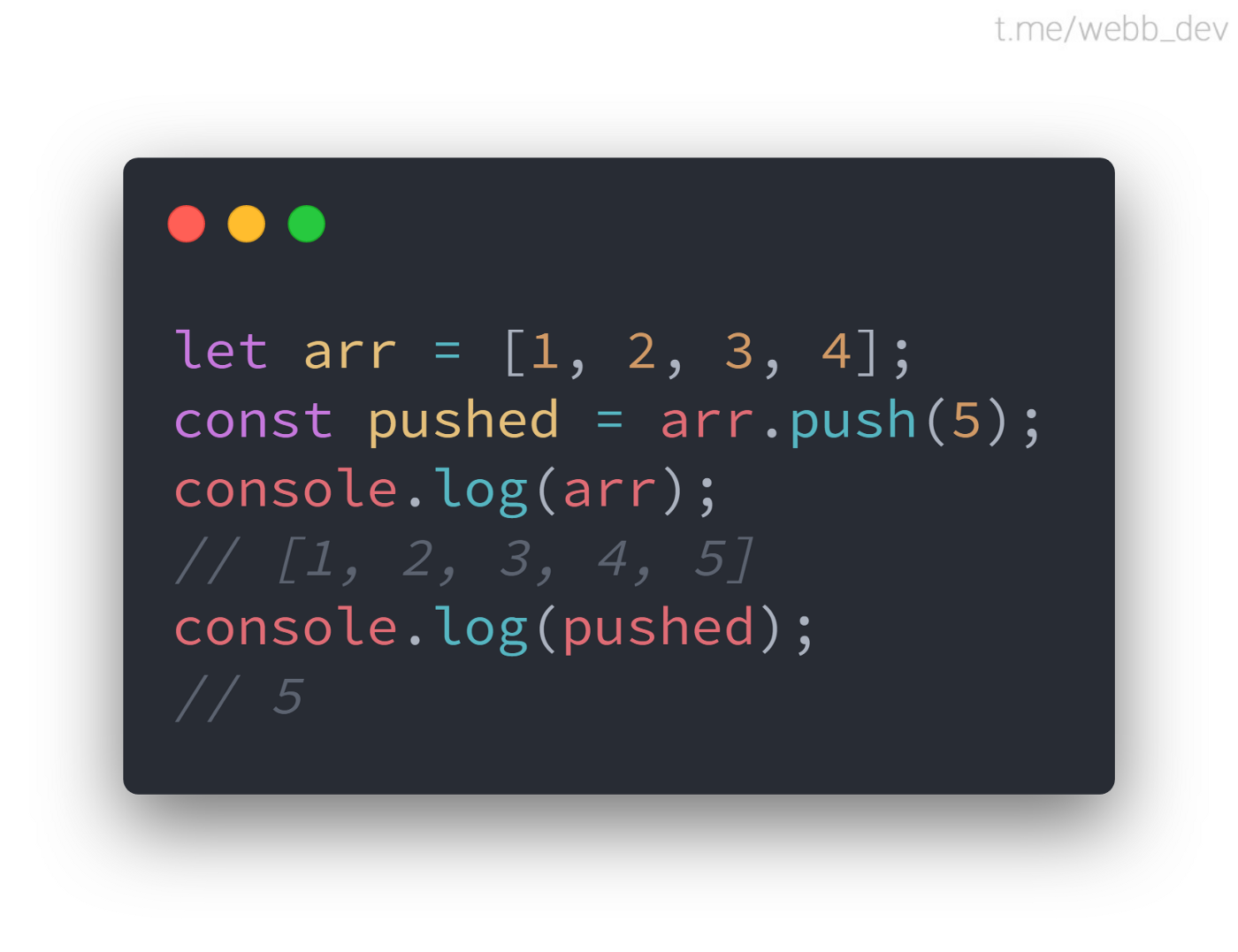 Метод позволяет добавлять элементы в конец массива. Он модифицирует массив, и, после завершения работы, возвращает элемент, добавленный в массив.