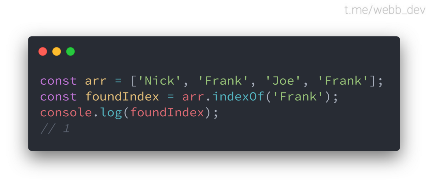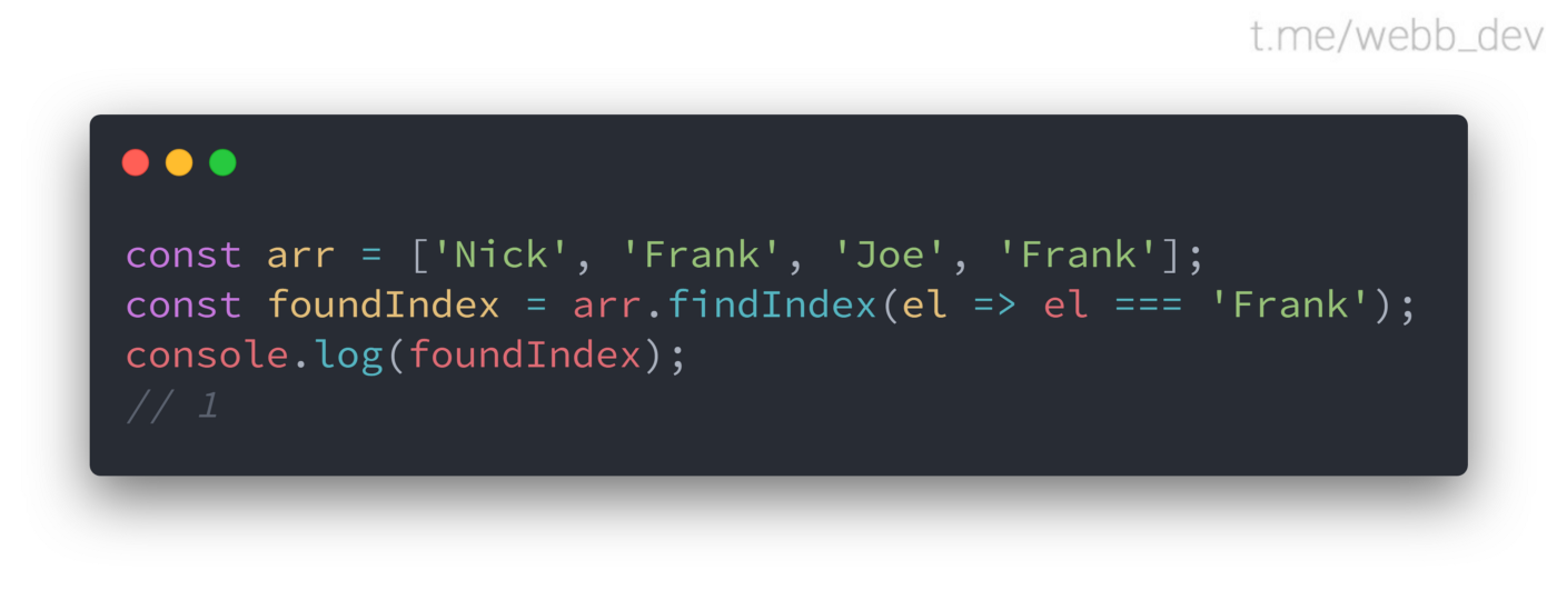 Метод очень похож на , но он, вместо того, чтобы возвращать первый подходящий элемент массива, возвращает индекс такого элемента. Для того чтобы лучше понять этот метод — взгляните на следующий пример, в котором используется массив строковых значений.