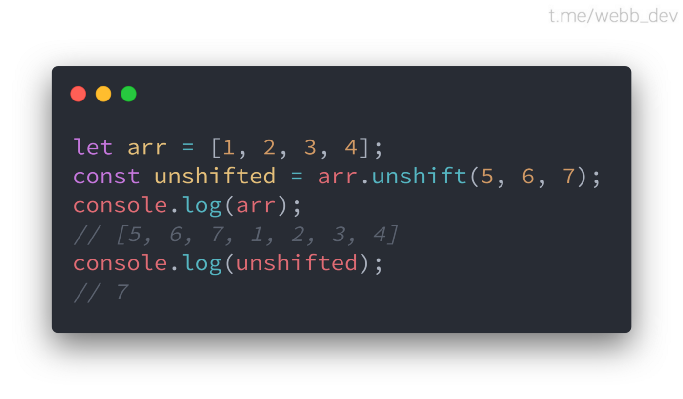 Метод добавляет один или большее количество элементов в начало массива. Он, опять же, модифицирует массив. При этом, в отличие от трёх других рассмотренных здесь методов, он возвращает новую длину массива.
