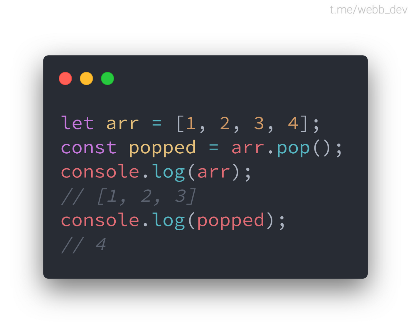 Метод удаляет из массива последний элемент. Он модифицирует массив и возвращает удалённый из него элемент.